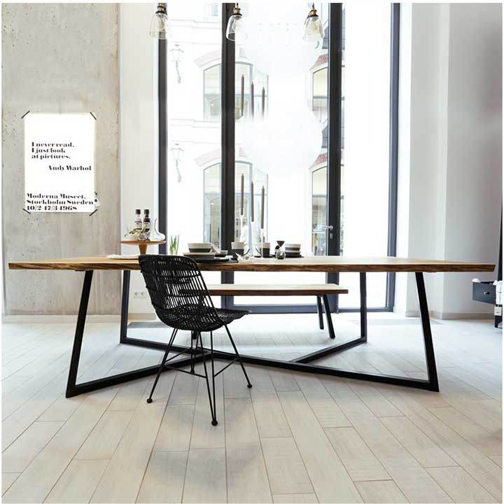 Mặt bàn thiết kế hình chữ nhật và có kích thước khá dài rộng nên rất phù hợp với những phòng bếp hiện đại, rộng rãi và cả nhà hàng sang trọng. Phần chân bàn được thiết kế hai hình chữ V nối liền nhau và nối thành khung gắn với mặt bàn. Thiết kế này tạo ra khung bàn vững chắc và cứng cáp không hề bị rung lắc hay lỏng lẻo trong quá trình sử dụng. Chân bàn thiết kế đơn giản và thanh nhỏ nên dễ dàng kết hợp với nhiều ghế đáp ứng nhu cầu ăn uống của những gia đình đông người hoặc vào dịp lễ, tết, sinh nhật. Sau khi sử dụng bạn còn có thể khéo léo sắp xếp bộ ghế dưới chân bàn cho ngăn nắp gọn gàng, sáng sủa và rộng rãi hơn. Ngoài bộ bàn ghế ăn thì tủ bếp hiện đại, ghế cafe cũng là món đồ nội thất không thể thiếu tăng thêm cảm hứng cho người nội trợ.