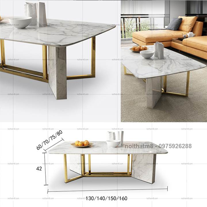 – Chất liệu: Bàn trà phòng khách được thiết kế bởi khung inox mạ vàng 304 sáng bóng kết hợp với mặt bàn đá cao cấp.