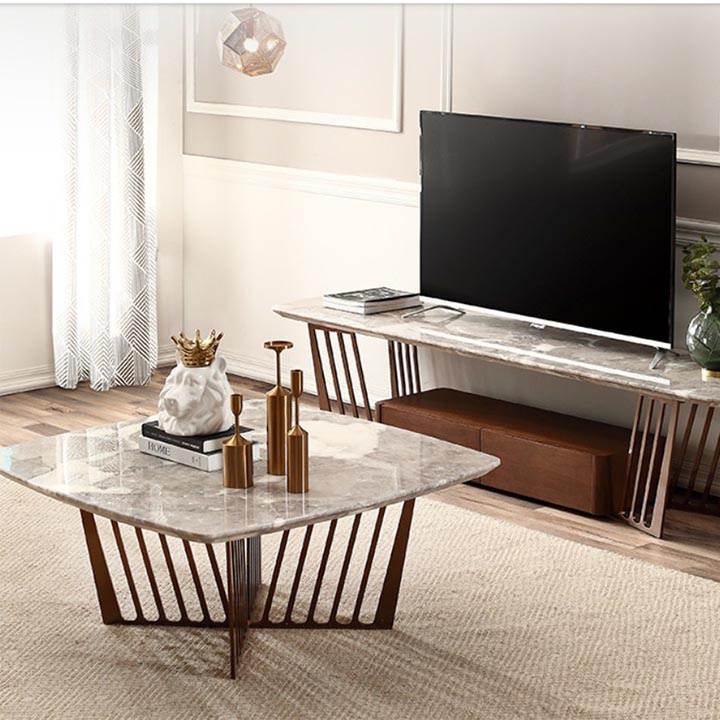 – Đồ decor kết hợp: Kết hợp bàn trà với bộ sofa màu ghi, thảm trải sàn màu ghi hoặc kệ tivi mặt đá có gam màu tương tự.