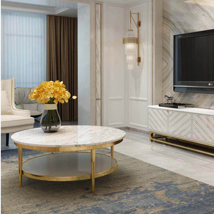 – Đồ decor kết hợp: Kết hợp bàn trà với kệ tivi hiện đại chân inox hoặc bộ sofa có khung chân inox cùng tone màu để tạo sự đồng nhất cho phòng khách