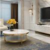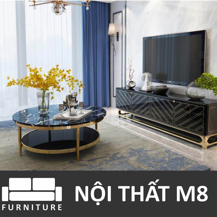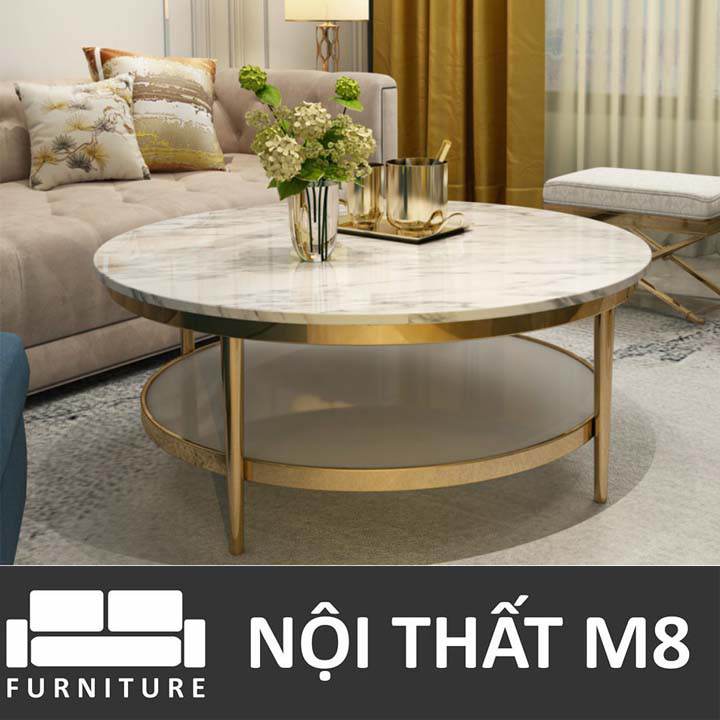Mẫu bàn sofa mặt đá phòng khách M8-4325 với vẻ ngoài bóng bẩy, chất liệu cao cấp cùng tính thẩm mỹ độc đáo chính là mảnh ghép lý tưởng cho nhưng không gian phòng khách được thiết kế theo phong cách tân cổ điển hoặc phong cách hoàng gia sang trọng. Bàn được thiết kế gồm 2 đợt không chỉ giúp giúp gia chủ có thêm không gian cất trữ đồ đạc mà còn tạo nên sự khác biệt, độ đáo so với bàn trà tại các gia đình khác. Khi lựa chọn bàn trà cho phòng khách, gia chủ cần lưu ý lựa chọn đồ decor cùng tone màu hoặc cùng chất liệu như bộ sofa chân inox vàng bóng, kệ tivi mặt đá cùng m