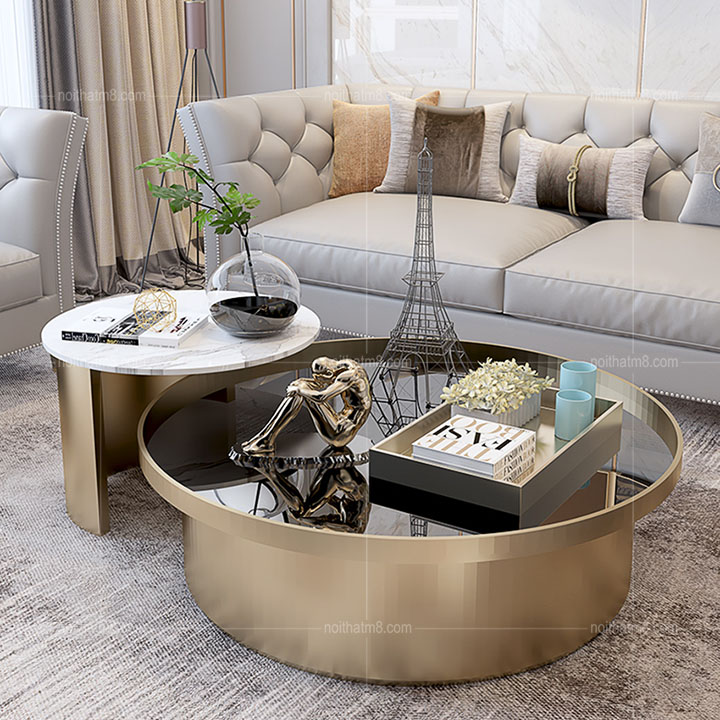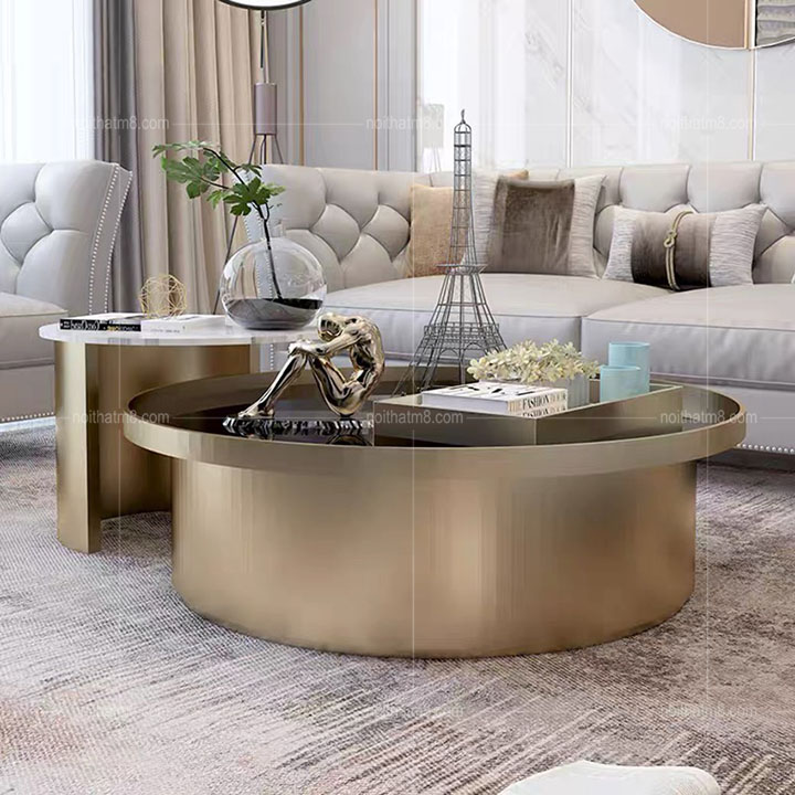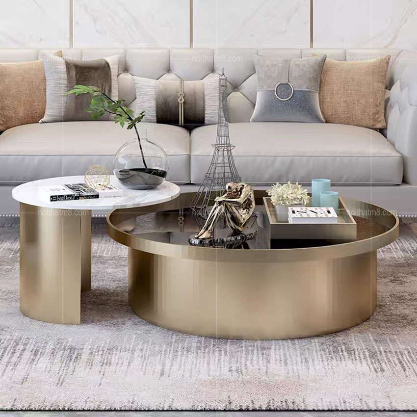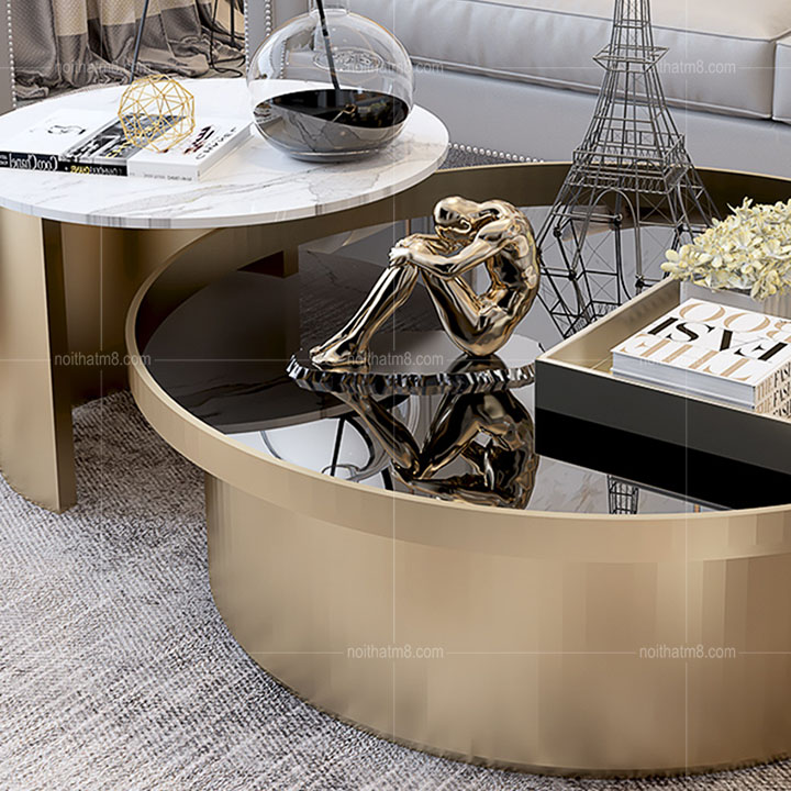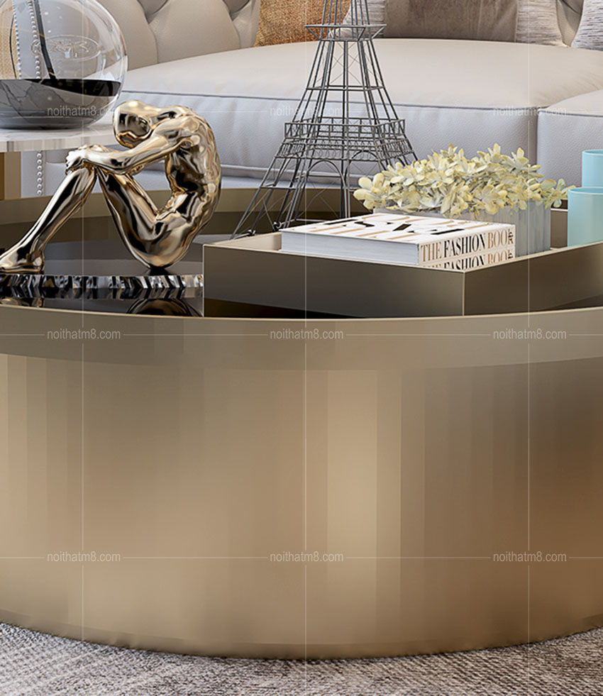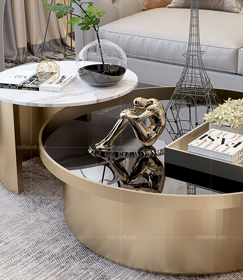 Được thiết kế tinh xảo, tỉ mỉ với dáng bàn tròn cách điệu, mẫu bàn trà đôi mạ titan cao cấp M8-4245 được rất nhiều khách hàng yêu thích và lựa chọn tại nội thất M8. Bàn trà nhỏ với mặt bàn là đá tự nhiên, bàn trà to mặt bàn là kính cường lực kết hợp với khung chân inox 304 mạ titan cao cấp rất sang trọng và tinh tế.